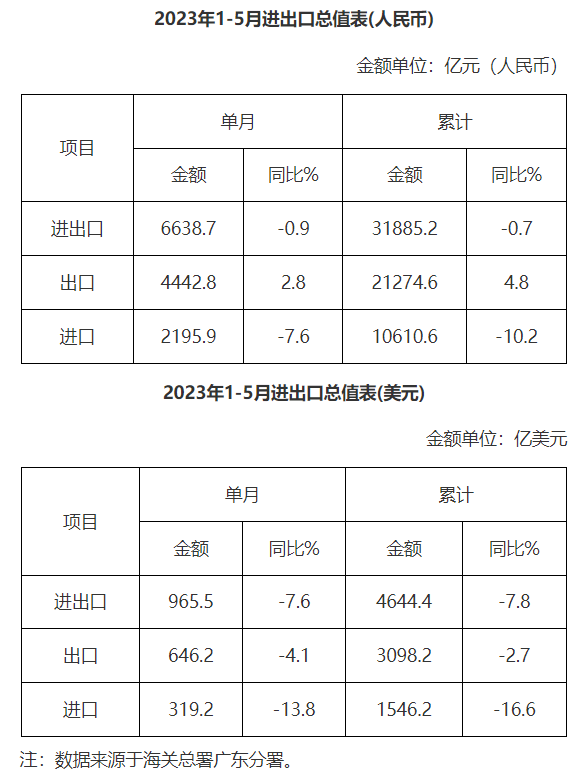 廣東省外貿進出口總值表(2023年1-5月)